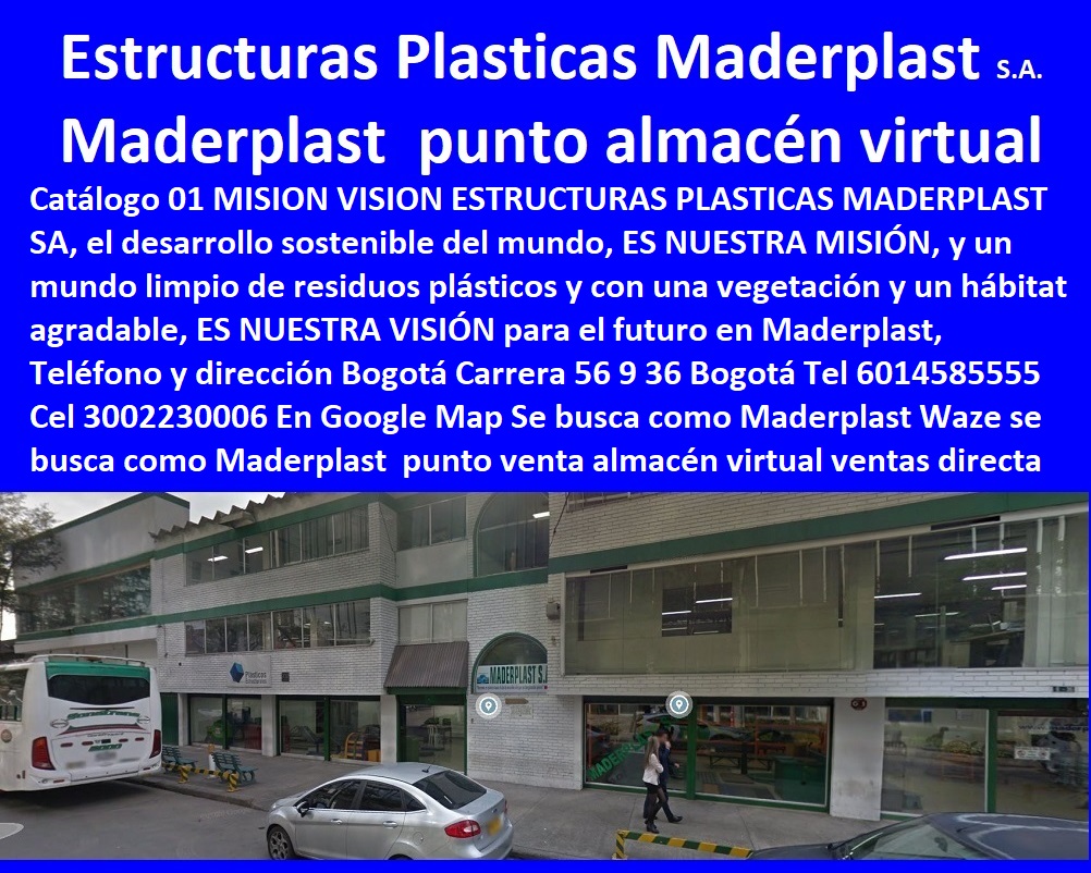 Estructuras Plasticas Maderplast SA Teléfono y dirección Bogotá Carrera 56 9 36 Bogotá Tel 6014585555 Cel 3002230006 En Google Map Se busca como Maderplast Waze se busca como Maderplast punto venta almacén virtual ventas directa 0