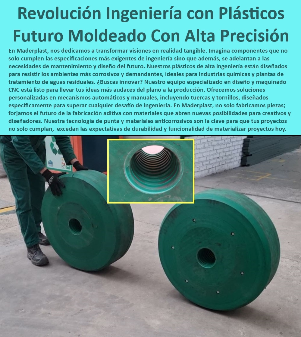 Presentación Soluciones para Ingenieros, Diseñadores y Jefes de Mantenimiento En Maderplast, lideramos la innovación en la fabricación de componentes industriales con nuestro enfoque en piezas de precisión de grandes formatos. Esta imagen captura el momento dinámico en el que se manejan nuestras avanzadas piezas plásticas, diseñadas para resistir ambientes corrosivos y garantizar durabilidad en aplicaciones exigentes. Nuestros tornillos sinfín y tuercas de gran tamaño no solo representan la cúspide de la ingeniería moderna, sino que también son testimonio de nuestro compromiso con la sostenibilidad, ofreciendo alternativas efectivas a los materiales tradicionales. Fabricados con plásticos de ingeniería de alta calidad, estos componentes son ideales para una variedad de aplicaciones industriales, desde maquinaria pesada hasta sistemas de transporte. En Maderplast, nos especializamos en convertir los desafíos de diseño más complejos en soluciones prácticas y efectivas. Entendemos las necesidades únicas de los inventores, ingenieros mecánicos y jefes de mantenimiento, proporcionando piezas que no solo cumplen, sino que superan las expectativas de rendimiento y eficiencia. ¡Transforma tu Industria con Maderplast!